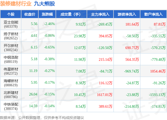 证券之星动静,4月1日,沪指报收3948。55,较前一买卖日上涨1。46%。拆建筑材行业全体表示较弱,较前一买卖日上涨1。03%,23只个股上涨,9只个股下跌。个股表示方面,拆建筑材行业当日领跌股为亚士创能(603378),该股当日报收5。56,下跌2。46%,成交量9。92万,从力资金净流出269。45万元。扬子新材(002652)以下跌0。86%紧随其后,该股当日成交量23。98万,从力资金净流入394。05万元。除此之外,开尔新材(300234)、中钢洛耐(688119)、伟星新材(002372)均进入当日熊股之列。具体个股列表见下表: